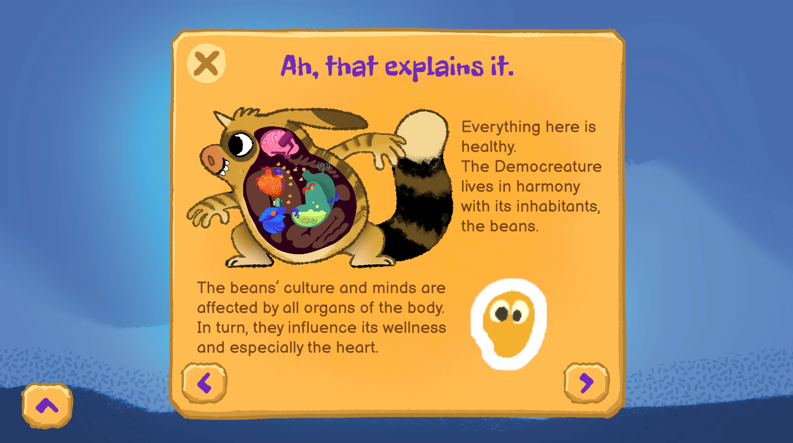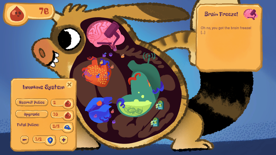 As a cartoony biology metaphor, this game highlights the tricky interplay between the most vital and most fragile organs of democracy; The Legislative as the pulse-giving heart, the Executive as the immune system, the Judicative as the brain and the stomach that digests and distributes news like nutrients. A diet of sour fake news and one-sided reports is sure to make a bad impact...